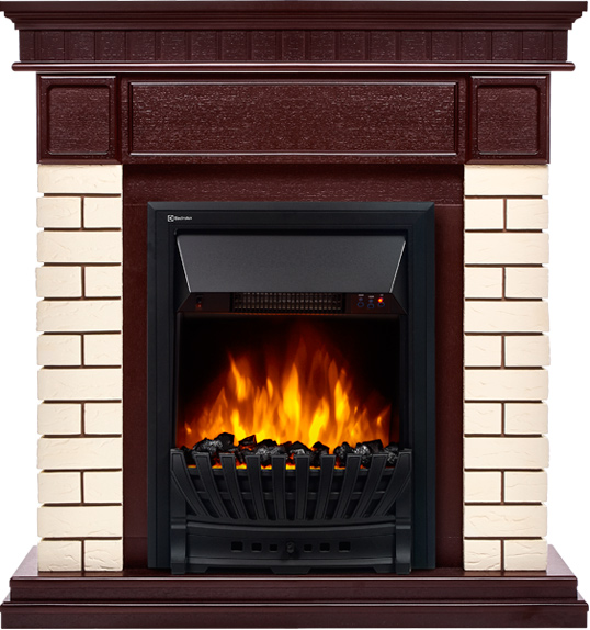 Портал выполнен в тёплой фактуре тёмного дуба и дополнен вставками под бежевый кирпич — такая комбинация подходит и для классики, и для современных интерьеров. Он не выглядит громоздко, но при этом создаёт в комнате ощущение завершённой композиции, особенно вокруг электрокамина.