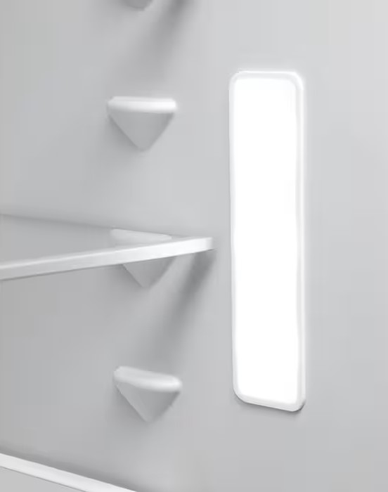 Дизайн ориентирован на практичность: гладкие поверхности легко очищаются, а белый оттенок гармонирует с большинством кухонных решений. Полки из стекла прочны и выдерживают ежедневную нагрузку, теплый свет LCD позволяет визуально оценивать содержимое, а рациональное распределение объёма минимизирует необходимость частого пополнения запасов. Компактность внешних габаритов сочетается с впечатляющей внутренней вместительностью, что делает модель удобной альтернативой отдельностоящим крупногабаритным прибором.