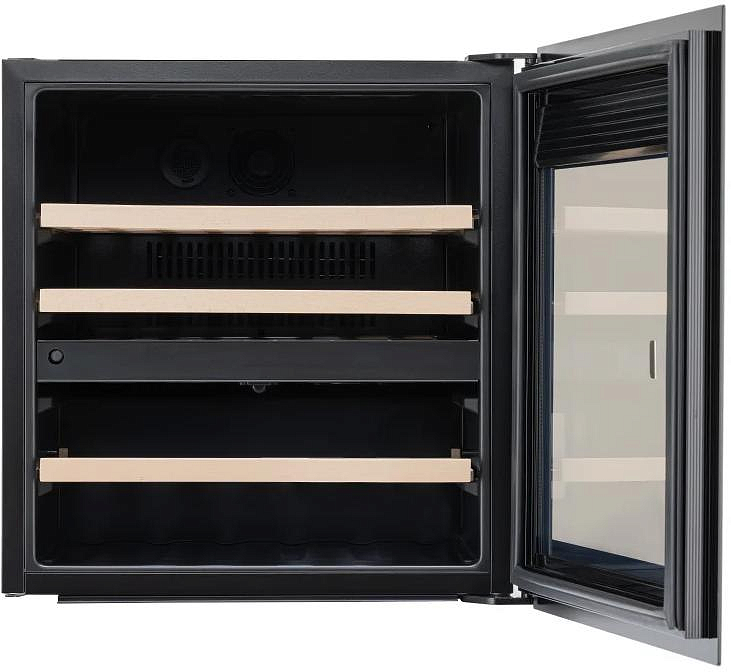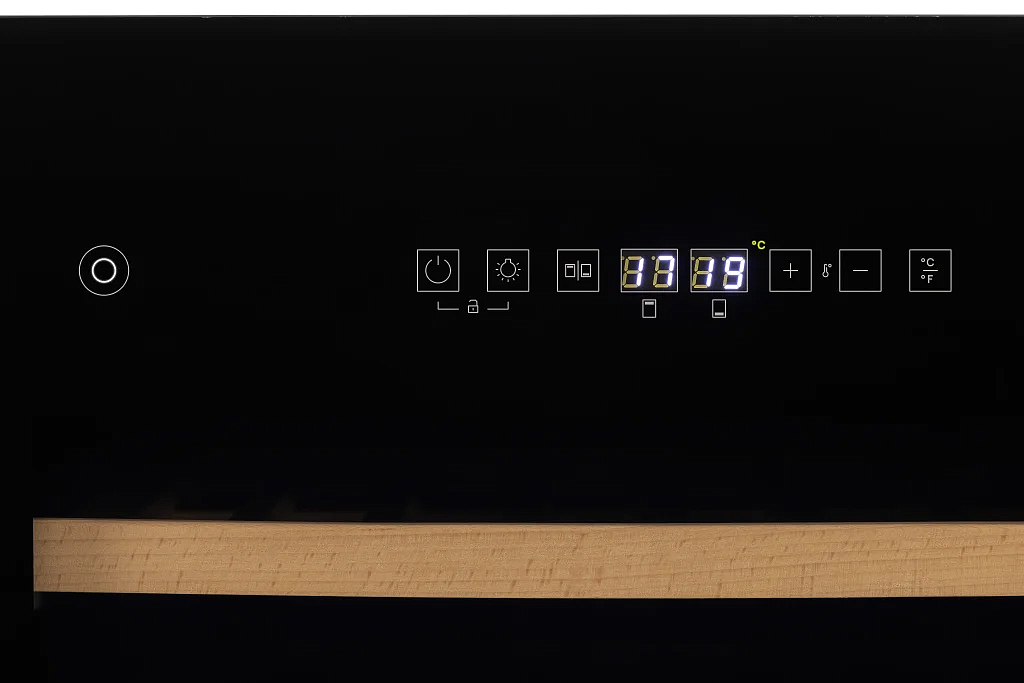 Дизайн аппарата продуман с акцентом на сочетание практичности и эстетики: строгие контуры корпуса визуально облегчают фасад, тёмная дверка скрывает содержимое, а натуральные деревянные полки создают тёплую атмосферу хранения. Встраивание осуществляется без ущерба для внешнего вида гарнитура, поскольку габариты позволяют интеграцию в стандартные ниши. Практичность усиливают телескопические направляющие, помогающие аккуратно выдвигать нагрузки, и равномерная подсветка, демонстрирующая коллекцию без искажения цветов этикеток. Сенсорная панель управления упрощает взаимодействие, делает регулировку быстрой и интуитивной; LED-индикатор отображает текущие параметры наглядно. Конструкция учитывает горизонтальное размещение посудин, что сохраняет пробки и предотвращает окисление вина. Материал полок — дерево — минимизирует вибрации и щадит стекло тары, обеспечивая мягкую опору.