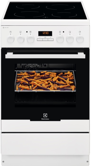 Плита Electrolux EKC95450AW классического белого оттенка предусматривает наличие электрического духового шкафа объемом 57 литров. Материал поверхности — стеклокерамика классического черного цвета, которая практична в работе и проста в уходе. Цифровой дисплей отображает ход работы, настройка процесса приготовления осуществляется посредством традиционных поворотных переключателей.
