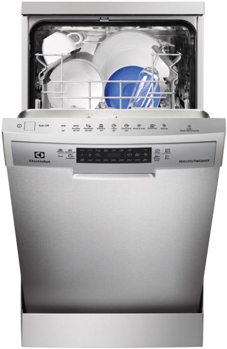 Посудомоечная машина Electrolux ESF 9470 ROX цвета «нержавеющая сталь» органично смотрится в интерьере современной кухни. Программа Autoflex автоматически устанавливает оптимальные параметры работы техники в зависимости от загрузки. Пользователю не нужно задумываться о том, какие настройки выбрать. Режим XtraPower на 40% повышает давление воды, что обеспечивает интенсивное мытье. С помощью этой программы можно отмыть сильнозагрязненные кастрюли и сковороды. Опция TimeSaver за счет увеличения давления и температуры воды уменьшает продолжительность цикла в два раза, что гарантирует комфорт эксплуатации.