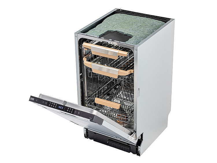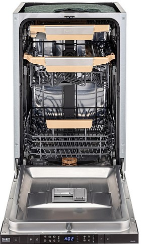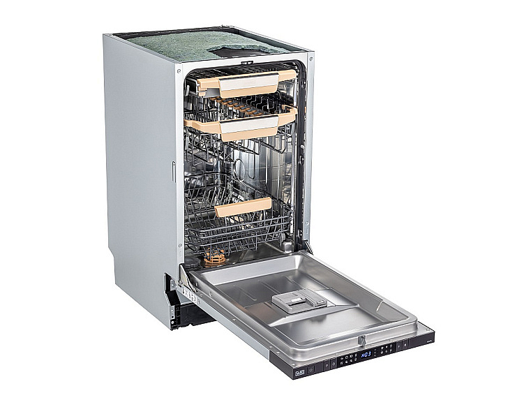 Элегантный фасад с скользящим креплением позволяет легко установить декоративную панель мебели, а узкий формат шириной 44,8 см делает модель идеальной для ограниченных ниш размером 82 х 45 х 58 см. Внутренний объём рассчитан на 10 комплектов посуды — оптимальный вариант для маленькой семьи или для тех, кто ценит упорядоченность и минимализм. Эргономика интерьера продумана до мелочей: регулируемая корзина QuickLift обеспечивает плавную перестановку уровня, мягкие держатели SoftGrip аккуратно фиксируют бокалы, а отдельный лоток для столовых приборов упрощает разделение предметов и ускоряет загрузку.