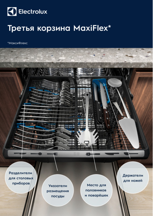 Внутренняя камера прибора изготовлена из прочной и долговечной нержавеющей стали, которая обладает улучшенными влаго и термостойкими свойствам. Верхняя корзина QuickLift регулируется по высоте, что позволяет размещать в нижней даже крупные высокие кастрюли, лоток для приборов MaxiFlex также можно настроить под нестандартные предметы, а специальные стабилизаторы SoftSpikes защищают хрупкую посуду от повреждений. Система защиты от протечек включает в себя шланг AquaControl, что позволяет снизить вероятность возникновения затопления.