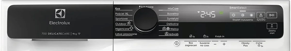 Панель содержит информеры о необходимости чистки: напоминания «Очистить конденсер», «Фильтр/Проблема со сливом», «Контейнер для конденсата заполнен». Кнопочные функции включают настройку задержки запуска, степень сушки, включение/выключение звукового сигнала, режим «освежить», старт/пауза и сушка по времени — это дает гибкость в выборе оптимального цикла. Размещение дозатора моющих средств слева удобно при сопоставлении с соседними приборами и позволяет рационально использовать пространство прачечной.