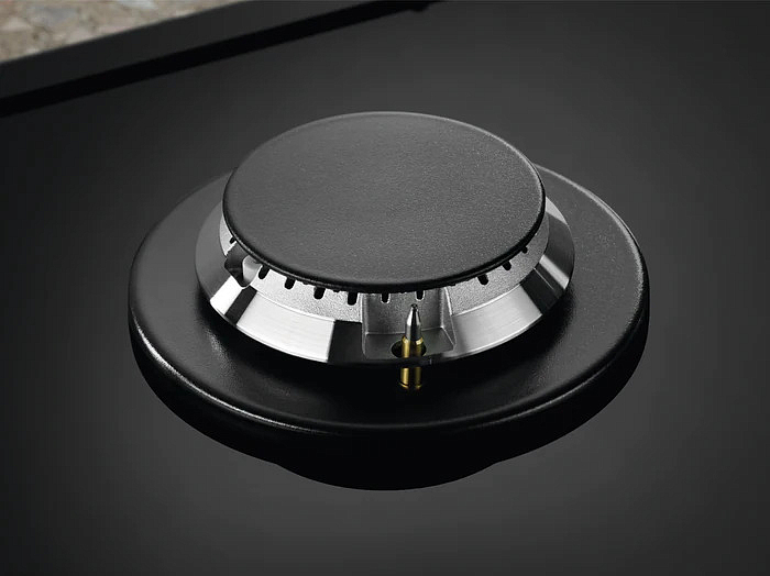 Газовая варочная панель — для тех, кто ценит надёжность классического огня и при этом не хочет жертвовать стилем. Поверхность из чёрного закалённого стекла выглядит строго и современно, а акценты из нержавеющей стали добавляют изысканности. Впишется в любую кухню — от минимализма до классики — и легко моется: достаточно протереть после готовки.
