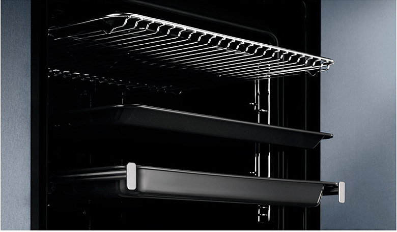 Управление — через утопленные сенсорные регуляторы: они не мешают при уборке и реагируют точно. Стены покрыты каталитическим слоем — жир разрушается сам при высокой температуре, остаётся только протереть. Вентилятор охлаждает корпус снаружи, а хромированные направляющие надёжно держат противни (два) и решётку (одна). Максимальная температура — 275 °C при мощности до 2990 Вт, чего хватает даже для сложных рецептов.