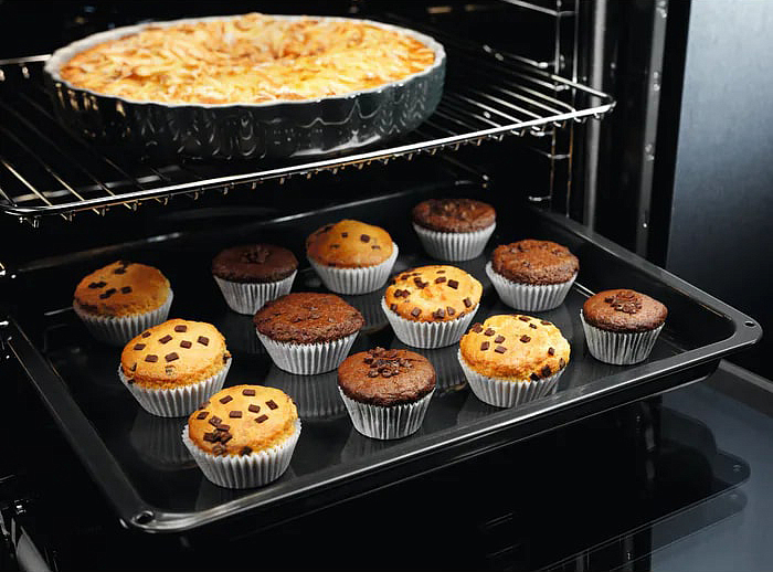 При включении духового шкафа вентилятор охлаждения автоматически запускается, обеспечивая своеобразную воздушную подушку вокруг прибора, которая предохраняет его внешние поверхности от перегрева, что не только позволяет избежать ожогов и деформации кухонного гарнитура, но и помогает сократить теплопотери, а значит и снизить расход электроэнергии при приготовлении пищи.