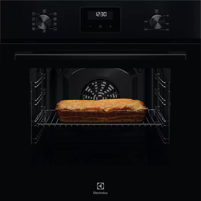 Духовой шкаф Electrolux LOF3H10BK подчёркивает современную стилистику серии 300 и подходит для минималистских интерьеров, где важна лаконичность и аккуратность. Встраиваемая конструкция разработана так, чтобы органично вписываться в стандартные кухонные модули: сама шторка имеет высоту 59,8 см, ширину 59,5 см и глубину 56 см, а размеры ниши для монтажа составляют 57,8–59 × 56 × 55 см, что делает установку быстрой и предсказуемой. Чёрная отделка создаёт подчёркнутый контраст с фасадами и визуально делает рабочую зону более строгой; дверца откидного типа с двумя стеклами обеспечивает безопасность и минимальные потери тепла при эксплуатации.